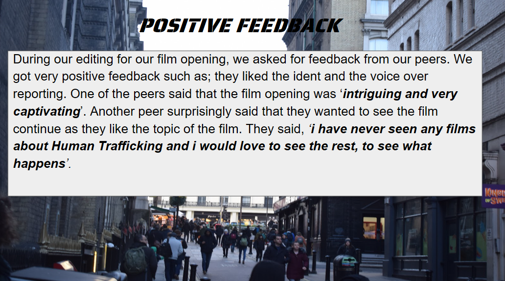 Editing - I participated by creating the fonts for the credits/ title, and I made so that it would suit our film genre. I also created the joint company idents for RFM FILMS and ALEXANDER PRODUCTIONS. Additionally, I imputed and approved the various sound effects and music that we put in our film opening.